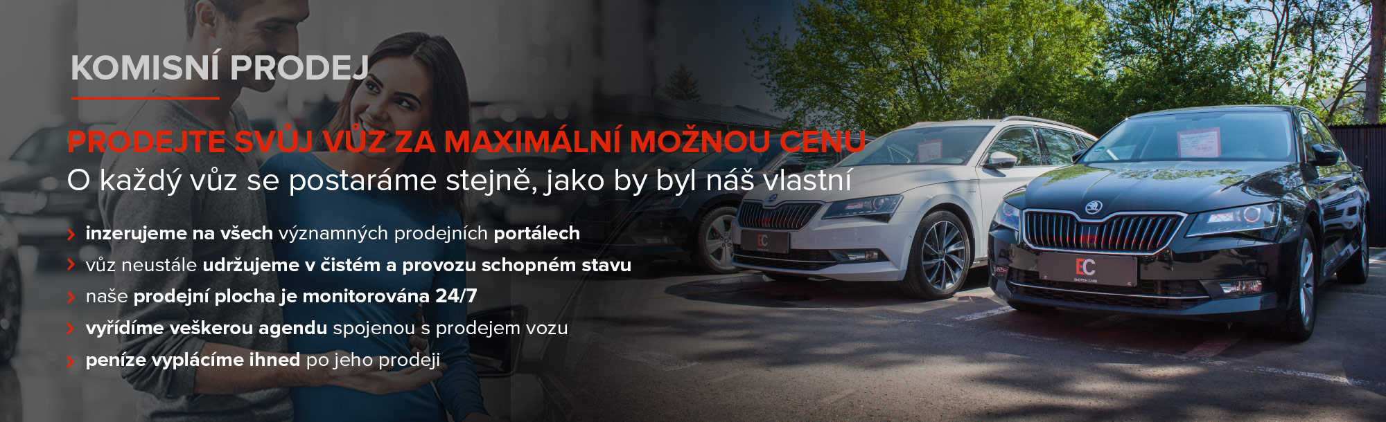 O každý vůz se při prodeji postaráme úplně stejně, jako by byl náš vlastní. Důkladná prohlídka, detailní čištění interiéru a vyleštění laku je u nás naprostou samozřejmostí. Váš vůz následně umístíme do naší nabídky, kterou posíláme na nejnavštěvovanějších inzertní portály (inzerujeme a prodáváme v rámci CZ, SK i EU trhu).